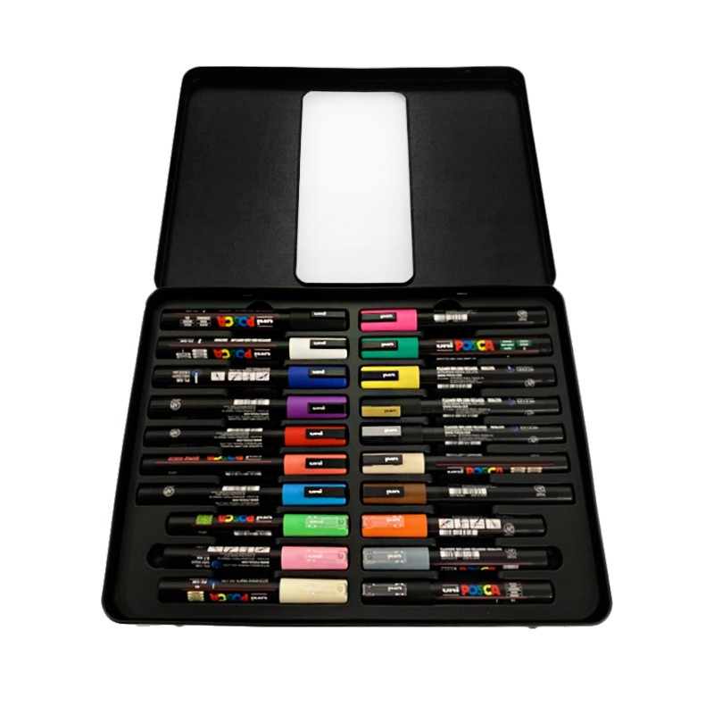 Uniwersalne pisaki Posca wypełnione farbą plakatową - do stosowania na większości powierzchni. Bez problemu pokryją takie powierzchnie jak szkło, ceramika, metal, plastik, drewno, kamień, płótno i tekstylia. Nietoksyczne, szybkoschnące markery o czystych, kryjących kolorach. W celu utrwalenia na ceramice lub szkle można je wypalać, w przypadku innych powierzchni wystarczy werniks zabezpieczający. Zestaw w metalowej kasecie, posiada plastikową wytłoczkę na której umieszczono 20 markerów w różnych kolorach i o różnych końcówkach. Obszerne metalowe pudełko pomieści także blok w formacie A5 lub A4. Komplet markerów POSCA to świetne rozwiązanie na prezent zarówno dla profesjonalistów jak i dla amatorów oraz dzieci.