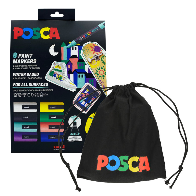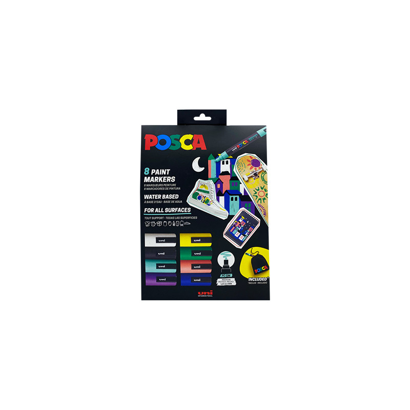 Zestaw pisaków Uni POSCA. Markery z płynną farbą plakatową przeznaczone do większości powierzchni. Z powodzeniem znajdą zastosowania zarówno wśród profesjonalistów jak i hobbystów, studentów, uczniów i dzieci. Pisaki 5M posiadają końcówkę o szerokości 1.8 - 2.5 mm. Kryjące, intensywne kolory świetnie sprawdzą się na takim podłożu jak papier, karton, kamień, drewno, metal, plastik, szkło oraz tkaniny. Do zestawu dołączono czarny materiałowy woreczek z logo POSCA, przeznaczony do przechowywania.