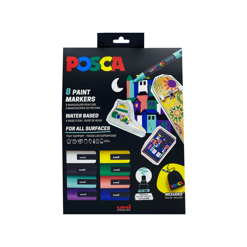 Zestaw markerów Uni POSCA 5M – 8 sztuk w podstawowej gamie kolorystycznej + woreczek. Końcówka o szerokości 1.8 - 2.5 mm. Markery z farbą plakatową. Więcej szczegółów