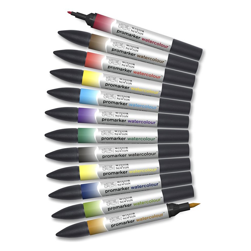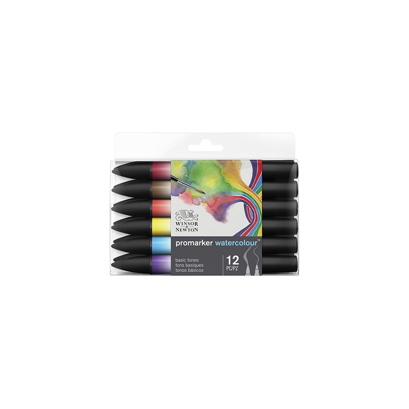 Zestaw pisaków Promarker Watercolour Basics Tones marki Winsor & Newton. 12 wodorozmywalnych markerów w gamie podstawowej.