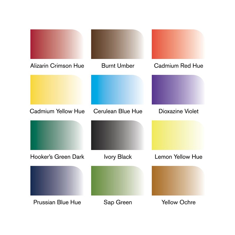 Kolory w zestawie: Alizarin Crimson Hue, Burnt Umber, Cadmium Red Hue, Cadmium Yellow Hue, Cerulean Blue Hue, Dioxazine Violet, Hooker's Green Dark, Ivory Black, Lemon Yellow Hue, Prussian Blue Hue, Sap Green, Yellow Ochre.