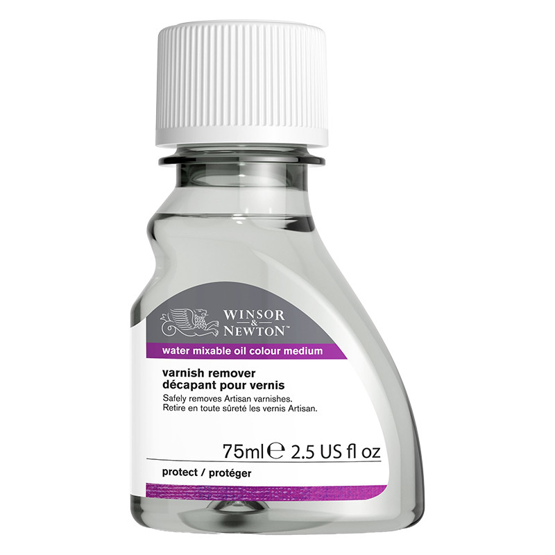Varnish Remower z serii Artisan marki Winsor & Newton - wodorozcieńczalny zmywacz do werniksów różnego typu. Bezpiecznie usuwa werniksy z serii Artisan umożliwiając oczyszczenie obrazu w celu ponownego naniesienia werniksu. Jeśli na zwilżonej zmywaczem ściereczce po przetarciu obrazu ujrzymy delikatny kolor mamy pewność, że werniks został usunięty.