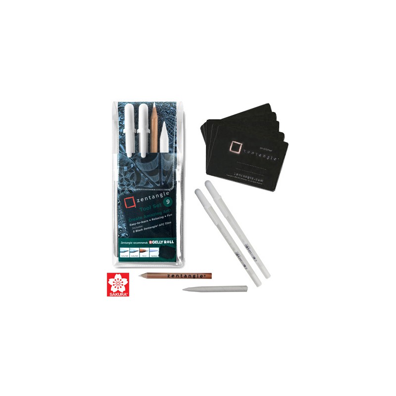 Zestaw do techniki Zentangle w którego skład wchodzą 2 długopisy żelowe w kolorze białym Gelly Roll 08 japońskiej firmy Sakura, 1 biała pastel w kredce, 1 tortillion oraz 5 arkuszy specjalnego, czarnego papieru o wymiarach 6,5 x 9cm. Całość zapakowana w funkcjonalne, elastyczne, przezroczyste zamykane etiu. Kompaktowy rozmiar kompletu pozwala uczynić go nieodłącznym elementem życia codziennego.