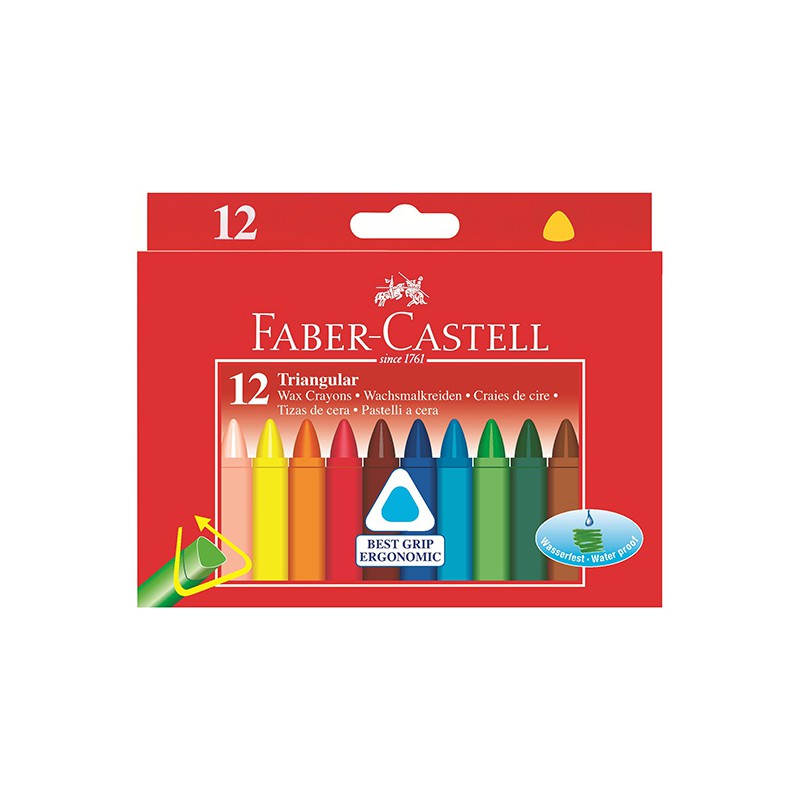 Zestaw trójkątnych, świecowych kredek firmy Faber-Castell posiada gamę 12 wyrazistych kolorów. Ich ergonomiczny kształt ułatwia prawidłowe chwytanie a zabezpieczony ochronnym papierem uchwyt zapobiega brudzeniu. Idealnie nadają się do łączenia różnego rodzaju technik; są wodoodporne.