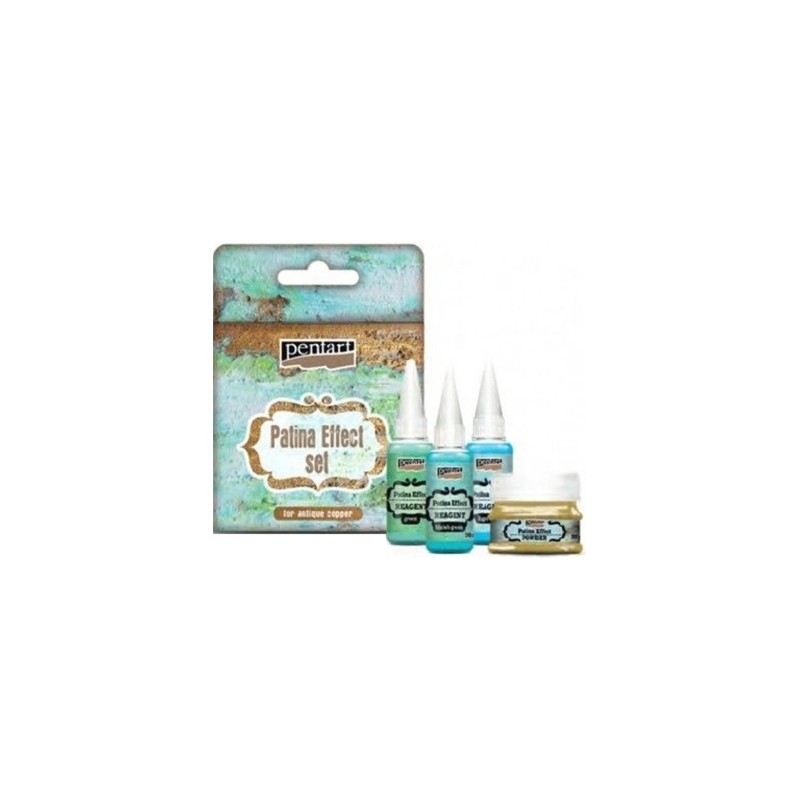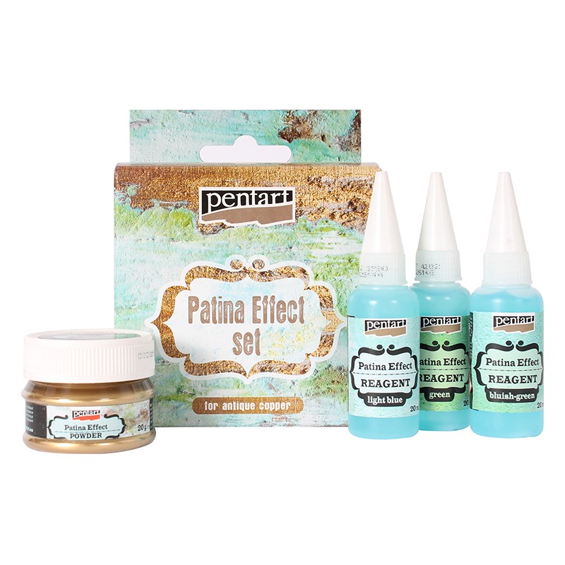 Zestaw do tworzenia powierzchni z patyną marki Pentart. Komplet zawiera 3 odczynniki i 1 proszek do efektu patyny. Pożądany, antyczny efekt uzyskamy na powierzchniach takich jak: karton, gips, terakota, drewno, kamień, itp. Ciekawe efekty uzyskamy łącząc patynę z techniką decopuage, scrapbooking oraz przy wszelkich pracach zdobniczych na gotowych przedmiotach jak np. doniczki, ramki, świeczniki, kasetki i inne dekoracje.