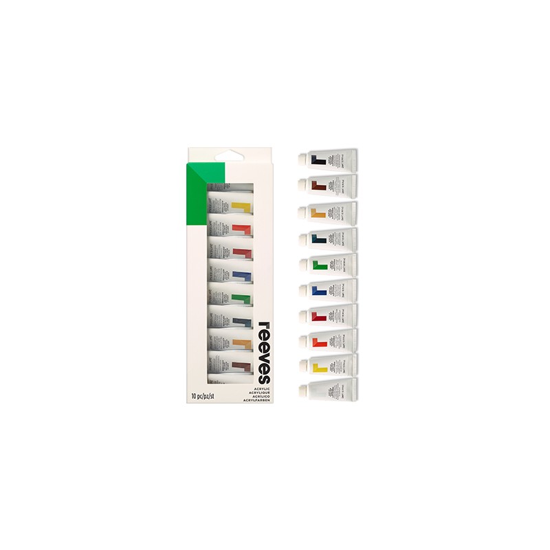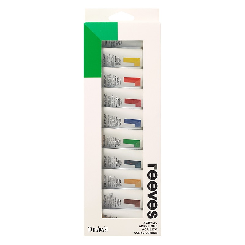 Zestaw farb akrylowych marki Reeves. 10 podstawowych kolorów, w tubkach o pojemności 22 ml. Kartonowe opakowanie. Więcej szczegółów