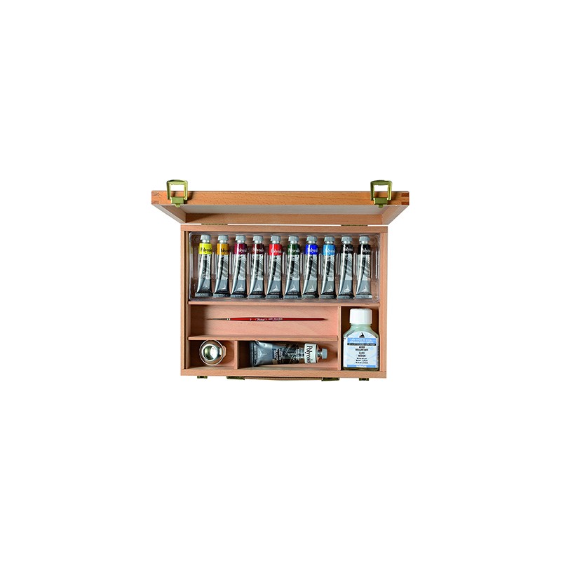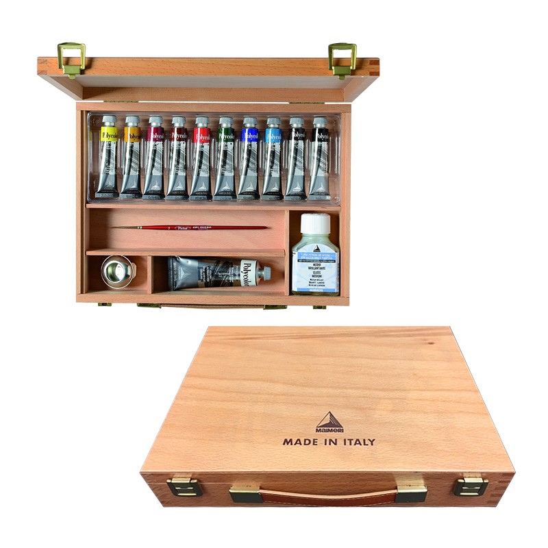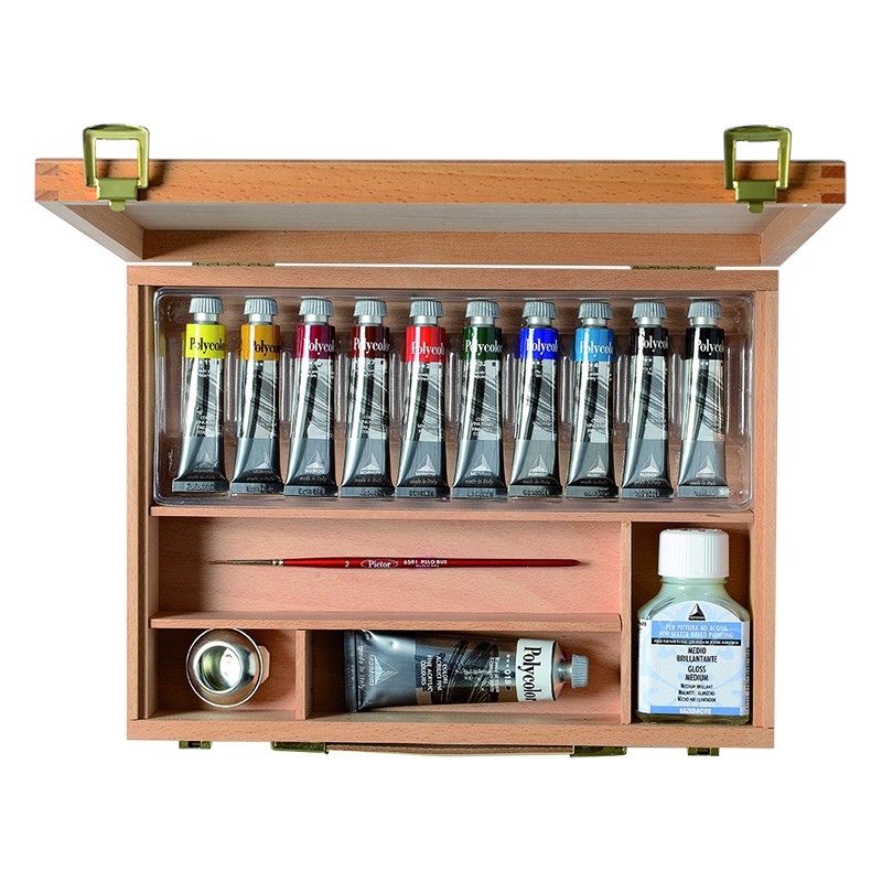 Zestaw farb akrylowych Polycolor marki Maimeri. 10 tubek o pojemności 20 ml, 1 tuba 60 ml. Dodatkowo akcesoria i medium + drewniana kaseta. Więcej szczegółów