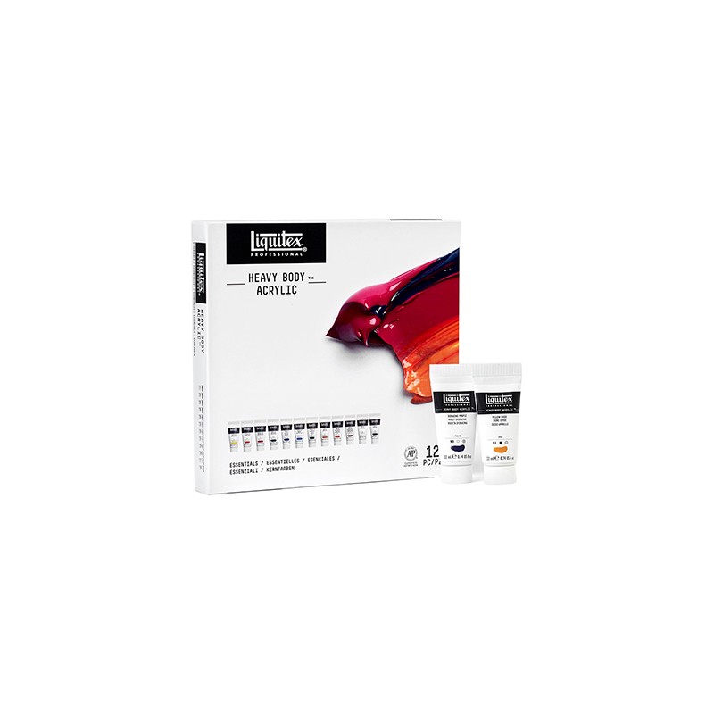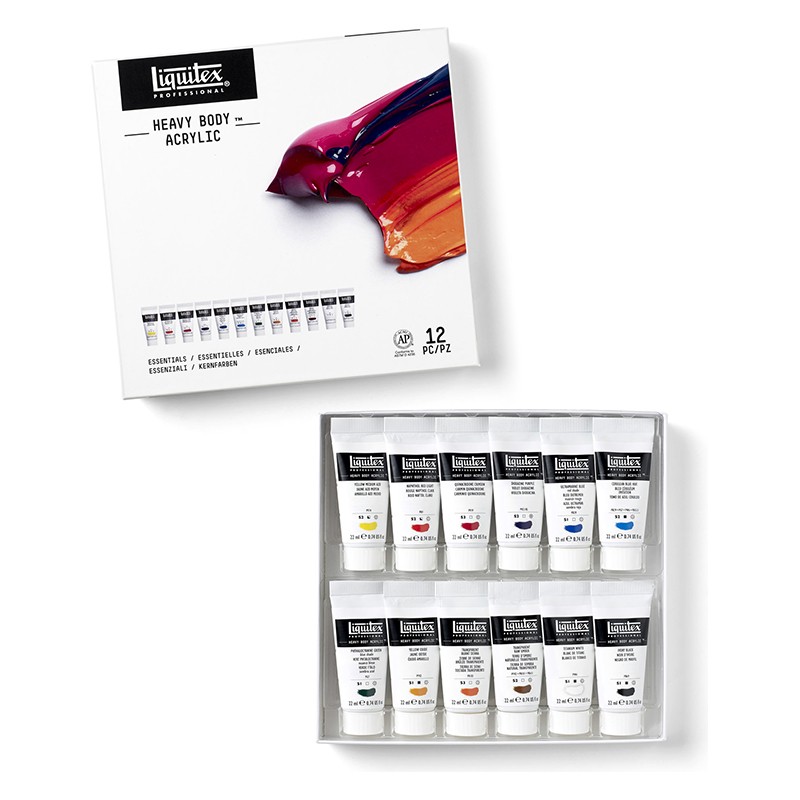 Zestaw farb akrylowych Heavy Body Essentials od marki Liquitex. 12 farb w podstawowej gamie kolorystycznej, w tubkach o pojemności 22 ml. Więcej szczegółów