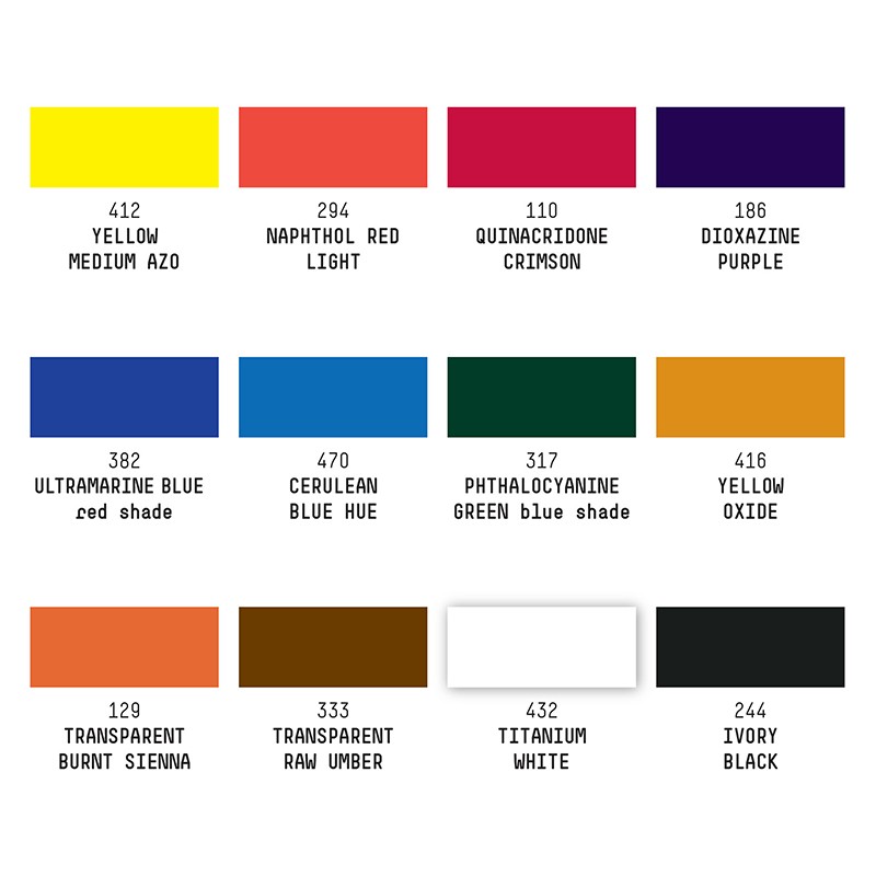 Kolory w zestawie: Yellow Medium Azo, Naphthol Red Light, Quinacridone Crimson, Dioxazine Purple, Ultramarine Blue (red shade), Cerulean Blue Hue, Phthalocyanine Green (blue shade), Yellow Oxide, Transparent Burnt Sienna, Transparent Raw Umber, Titanium White, Ivory Black.