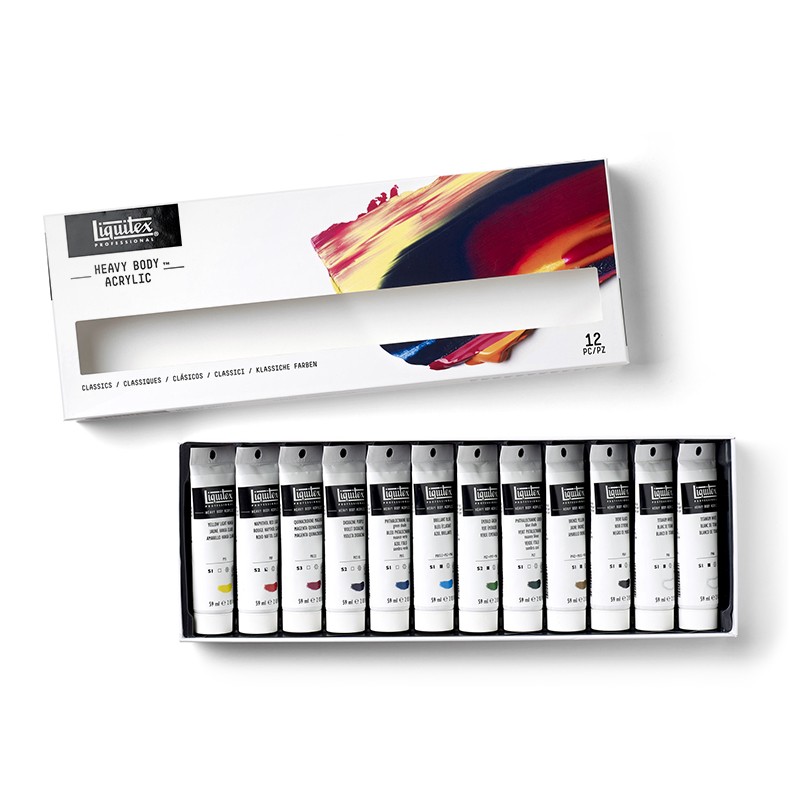 Heavy Body Acrylic Classic od marki Liquitex – zestaw farb akrylowych o gęstej konsystencji, 12 podstawowych kolorów w tubkach o pojemności 59 ml.