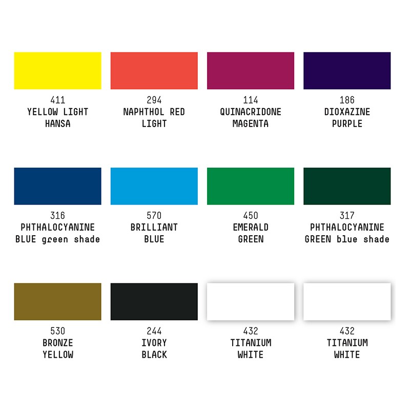 Kolory w zestawie: Yellow Light Hansa, Naphthol Red Light, Quinacridone Magenta, Dioxazine Purple, Phthalocyanine Blue (green shade), Brilliant Blue, Emerald Green, Phthalocyanine Green (blue shade), Bronze Yellow, Ivory Black, 2 x Titanium White.