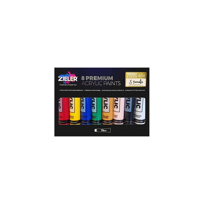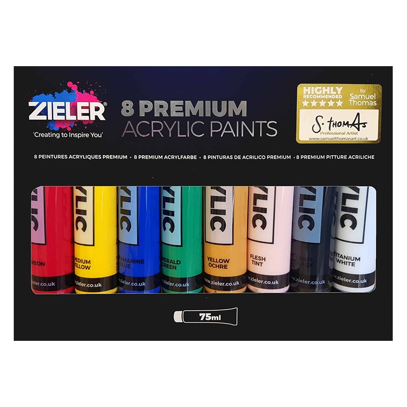 Premium Acrylic Paints – zestaw farb akrylowych jakości premium, marki Zieler. 8 intensywnych kolorów w plastikowych tubkach o pojemności 75 ml. Więcej szczegółów