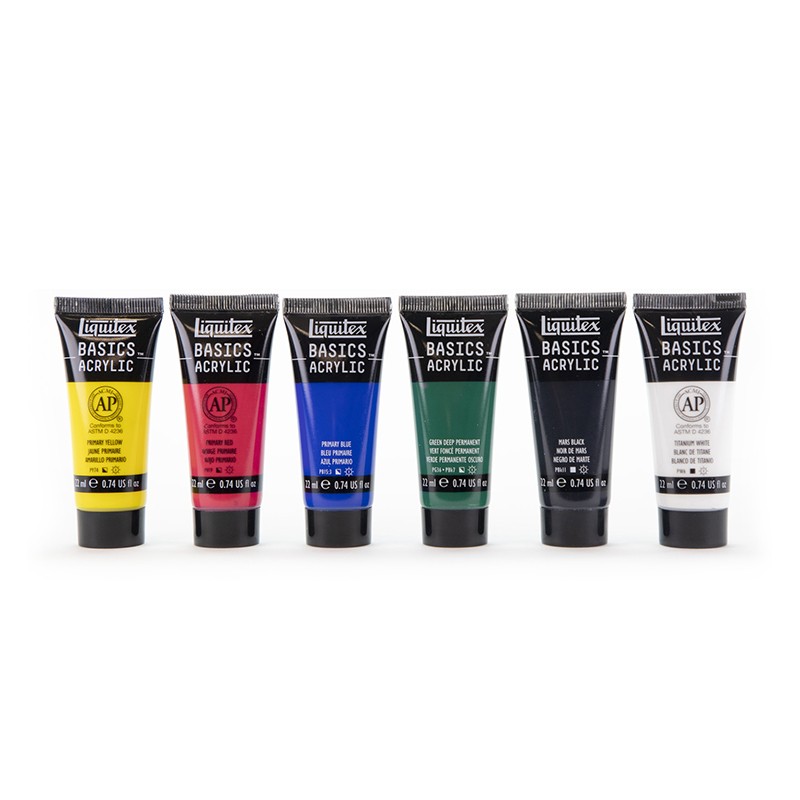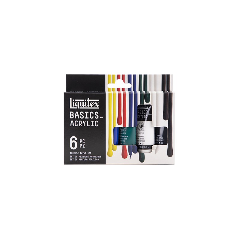 Zestaw farb akrylowych Basics Acrylic marki Liquitex. Opakowanie 6 tubek o pojemności 22 ml. Podstawowa gama kolorów.
