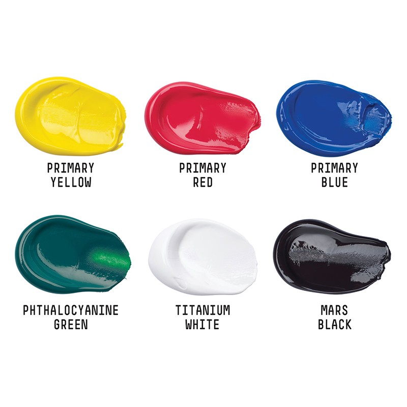 Kolory w zestawie: Primary Yellow, Primary Red, Primary Blue, Phthalocyanine Green, Titanium White, Mars Black.