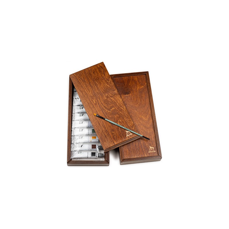 Farby akrylowe Colours polecane są zarówno dla wymagających profesjonalistów jak i studentów. Dzięki swojej praktyczności i wytrzymałości sięga po nie coraz większe grono twórców. Farby składają się z emulsji wodnej w polimerze akrylowym, w którym nastąpiła dyspersja pigmentu, po wyschnięciu stają się całkowicie niezmywalne oraz matowe. Akryle tej serii mogą być mieszane z sobą dając możliwość tworzenia artyście bogatej gamy kolorów i odcieni. Komplet podstawowych 10 kolorów, ujęty w poręczny, elegancki piórnik wykonany z lakierowanego drewna (wymiary: 13,5 cm x 30 cm). Produkt znakomicie nadaje się na prezent (zawiera banderolę z nadrukowaną kokardą).