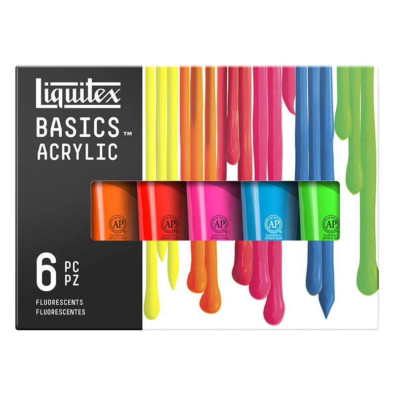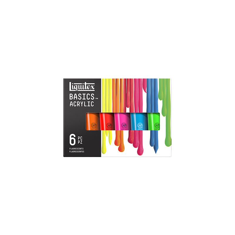 Komplet farb akrylowych Basics Liquitex. Farby na bazie wody do malowania takich powierzchni jak karton, tektura, gips, drewno, metal itp. W zestawie znajduje się 6 kolorów w fluorescencyjnej gamie barw, które świetnie sprawdzą się do malowania abstrakcji lub dekorowania. Po skończonej pracy narzędzia/pędzle należy umyć w ciepłej wodzie z mydłem lub profesjonalnymi preparatami do czyszczenia pędzli. Farba po wyschnięciu jest trwała i wodoodporna.