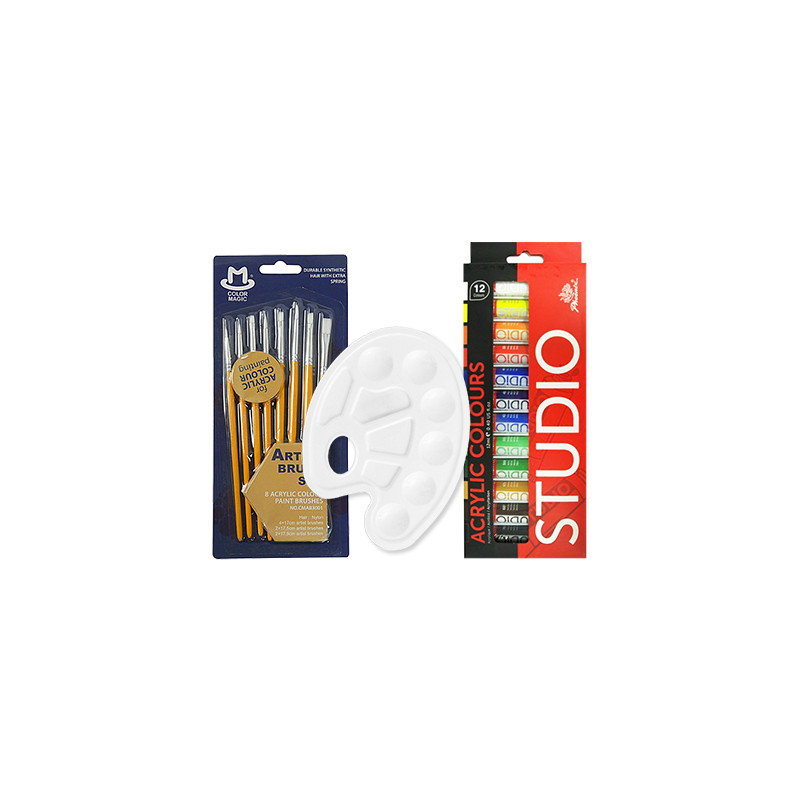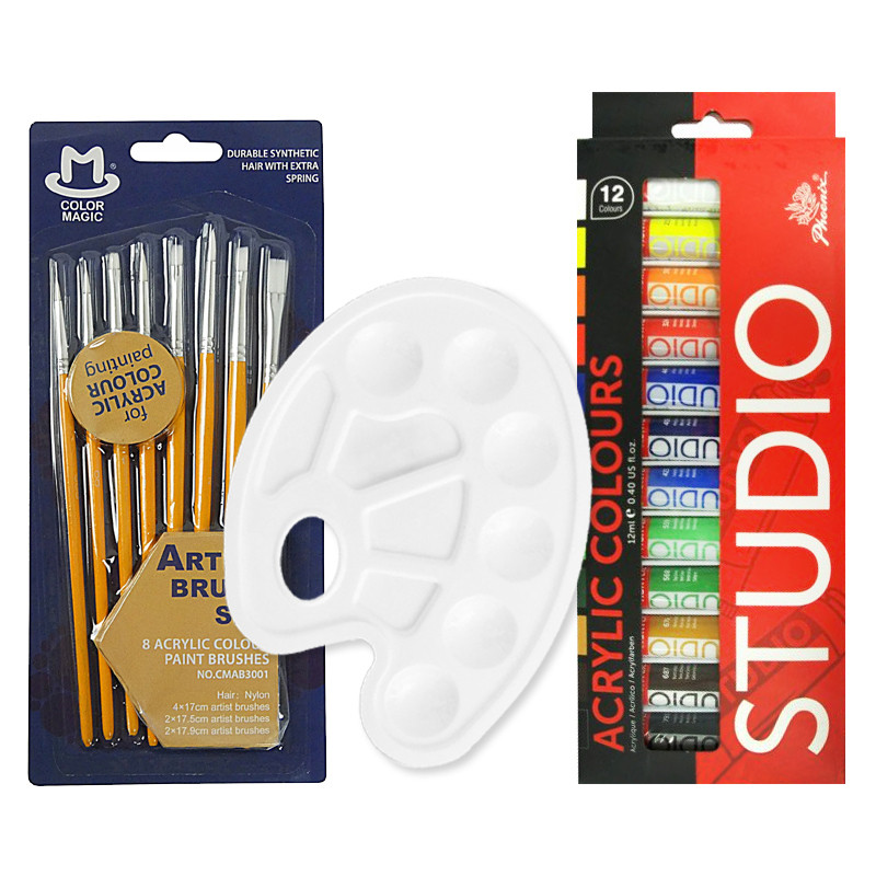 Farby akrylowe marki Phoenix + akcesoria. Zestaw 12 kolorów w tubkach o pojemności 12 ml, komplet pędzli oraz plastikowa paleta malarska. Więcej szczegółów