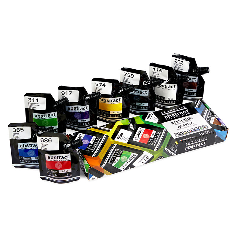Farby akrylowe Abstract firmy Sennelier. Zestaw 8 kolorów w saszetkach o pojemności 40 ml. Podstawowa gama barw. Więcej szczegółów