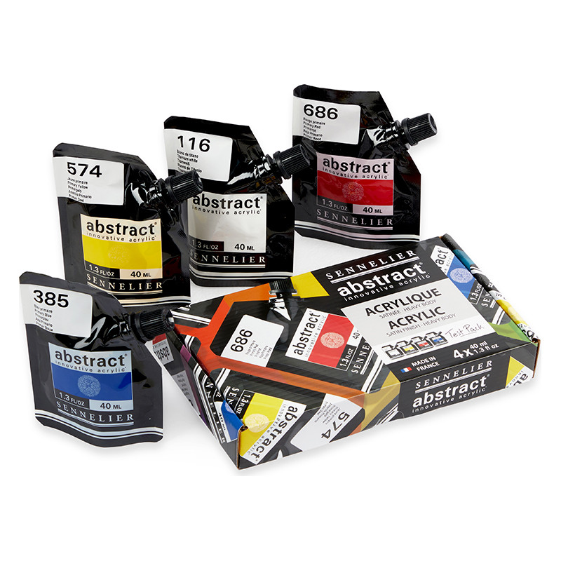 Farby akrylowe Abstract firmy Sennelier. Zestaw 4 kolorów w saszetkach o pojemności 40 ml. Podstawowa gama barw. Więcej szczegółów