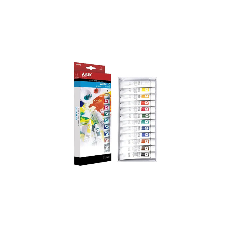 Zestaw 12 wodorozcieńczalnych farb akrylowych marki Artix. Do malowania na płótnie, kartonie, drewnie, gipsie itp. Po wyschnięciu wodoodporne. Pigmenty dobrej jakości gwarantują wysoką światłoodporność a zastosowane spoiwo zapewnia łatwe rozprowadzanie farby. Farby bardzo dobrze mieszają się między sobą. 12 podstawowych kolorów umieszczonych w tubkach o pojemności 12 ml. Całość w kartonowym pudełku.