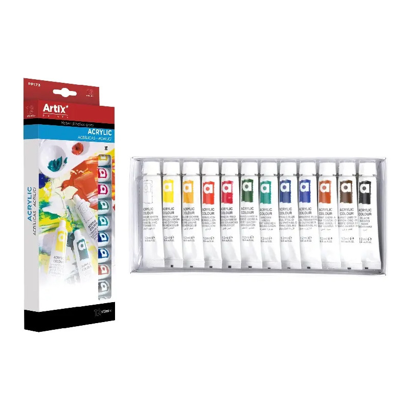 Farby akrylowe marki Artix. Zestaw 12 kolorów w tubkach o pojemności 12 ml. Kartonowe opakowanie. Więcej szczegółów