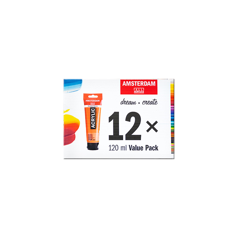Komplet farb akrylowych popularnej serii Amsterdam holenderskiej marki Royal-Talens. 12 tubek o pojemności 120 ml.