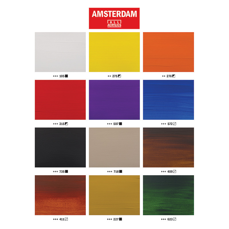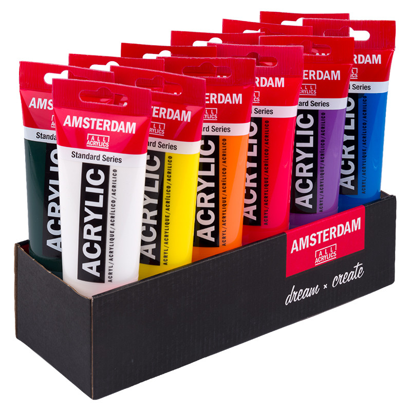 Farby akrylowe na bazie wody. Wysoka pigmentacja, nasycone kolory i kremowa konsystencja sprawiają, że praca tymi farbami jest przyjemna i bezproblemowa. wszystkie kolory dobrze mieszają się ze sobą tworząc nowe odcienie i barwy. Farby Amsterdam można nakładać na płótno, drewno, gips, karton i plastik. Każda tubka zawiera oznaczenie siły krycia koloru, zawarte w nim pigmenty oraz stopień światłoodporności. 12 kolorów w tubkach o pojemności 120 ml to solidna baza by zacząć malować obrazy