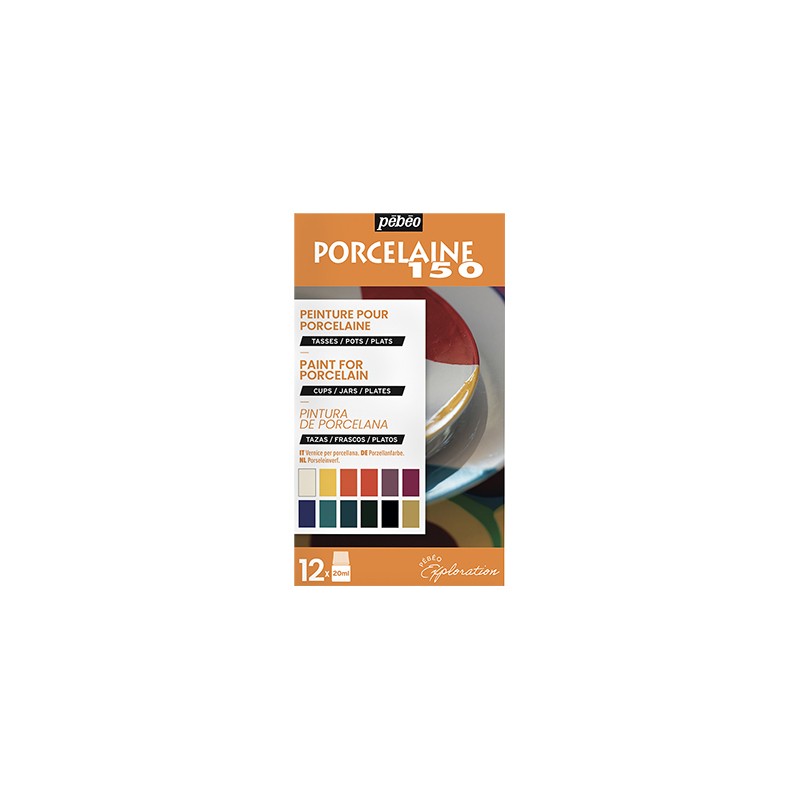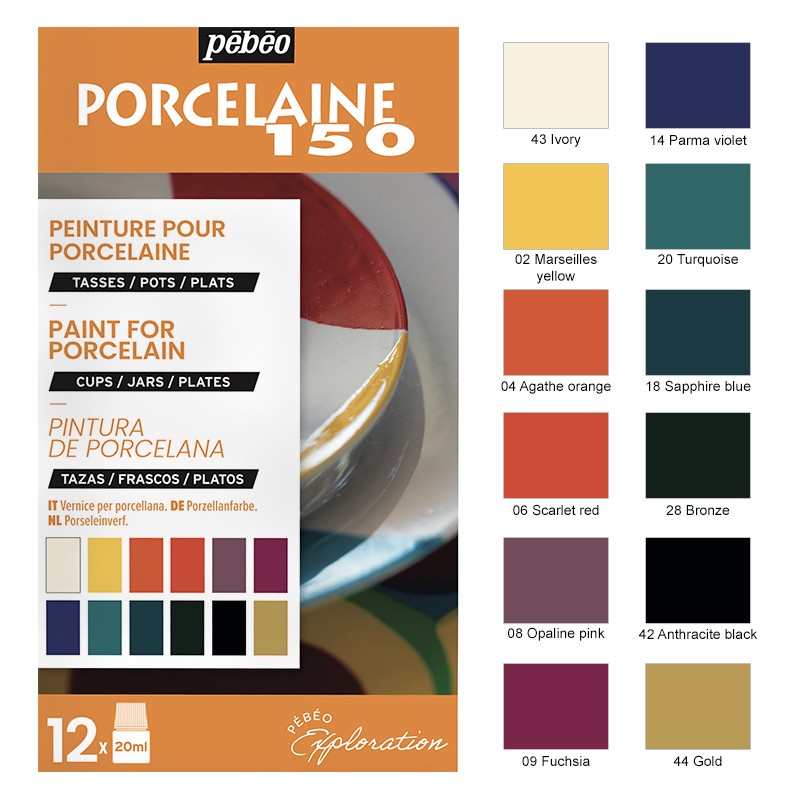 Zestaw farb do ceramiki serii Porcelaine 150 francuskiej firmy Pebeo. Komplet składa się z 12 farb w słoiczkach o pojemności 20ml. Farby na bazie wody. Więcej szczegółów