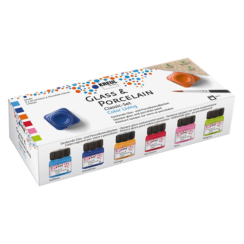 Komplet farb do ceramiki na bazie wody Glass & Porcelain Classic marki C.Kreul. Nakładanie odbywa się przy pomocy miękkiego pędzla. Czas potrzebny na wyschnięcie i utrwalenie farby to minimum 4 godziny od zakończenia prac nad dekoracją. Zdobienie można dodatkowo zabezpieczyć, wypalając przedmiot w piekarniku - temperatura 160°C, czas 90 minut. Po tym zabiegu, ceramikę można bezpiecznie myć, nawet w zmywarce.