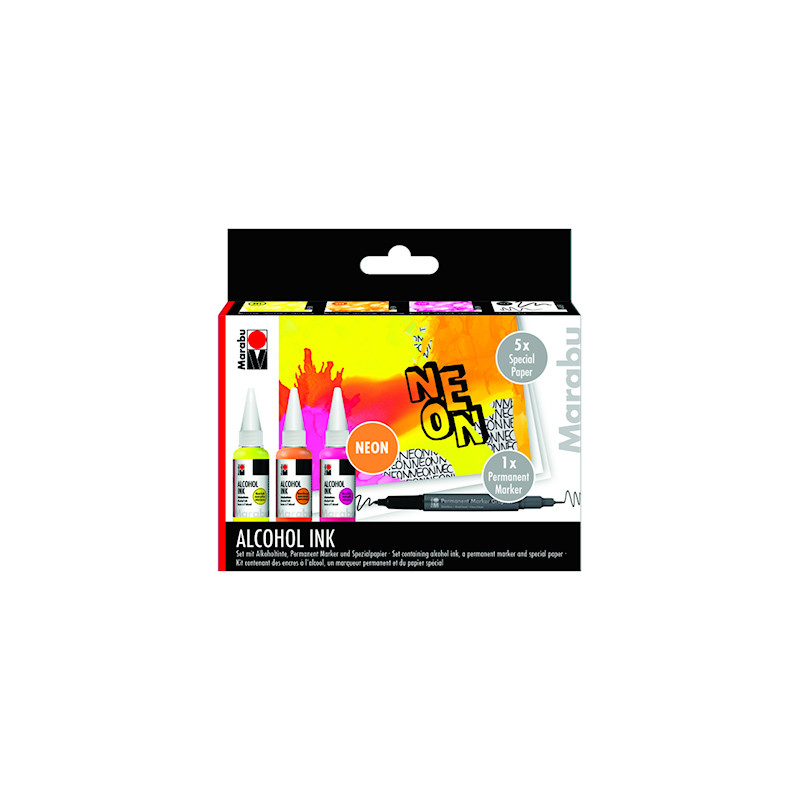 Neon – Alkohol Ink Marabu. Zestaw tuszy alkoholowych, 3 neonowe kolory w butelkach o pojemności 20 ml, pisak, papiery, broszura.