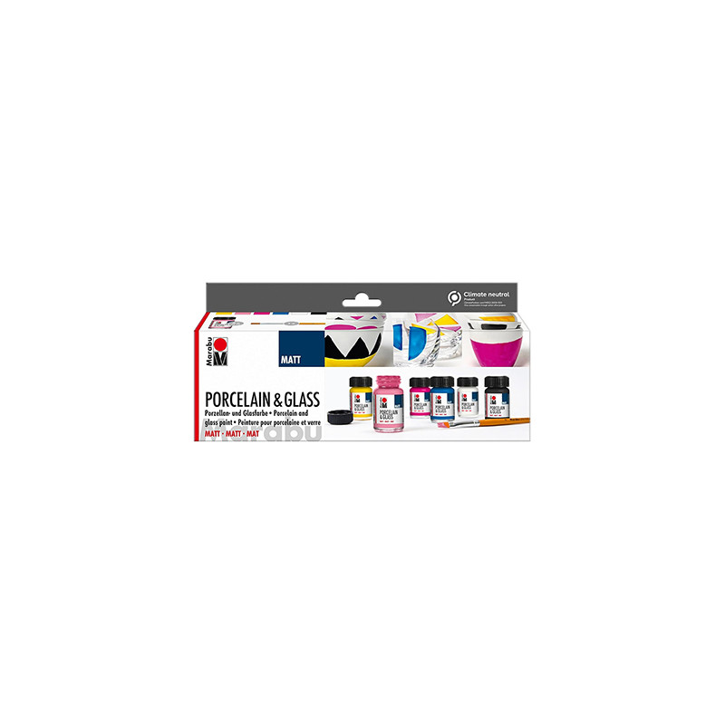 Komplet farb do porcelany i szkła marki Marabu. 6 kolorów w słoiczkach o pojemności 15 ml. Wszystkie kolory doskonale łączą się między sobą tworząc nowe barwy i odcienie. Do zestawu dołączono płaski pędzel syntetyczny do nakładania farb. Produkt należy nakładać na oczyszczoną, pozbawioną kurzu powierzchnię szklaną, ceramiczną lub akrylową. Farby wysychają po 30 minutach, natomiast utrwalają się po 3 dniach, zyskując odporność na mycie w zmywarce (do 50°C). Wegańska formuła nie zawiera składników pochodzenia zwierzęcego. Przed użyciem farby dobrze wymieszać (nie wstrząsać - mogą wtedy powstawać bąbelki powietrza).