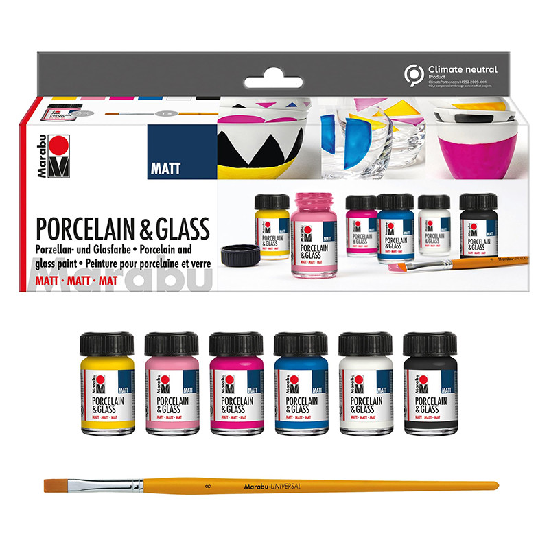 Matt Porcelain & Glass – wodne matowe farby do szkła i ceramiki marki Marabu, 6 kolorów po 15 ml + pędzel.