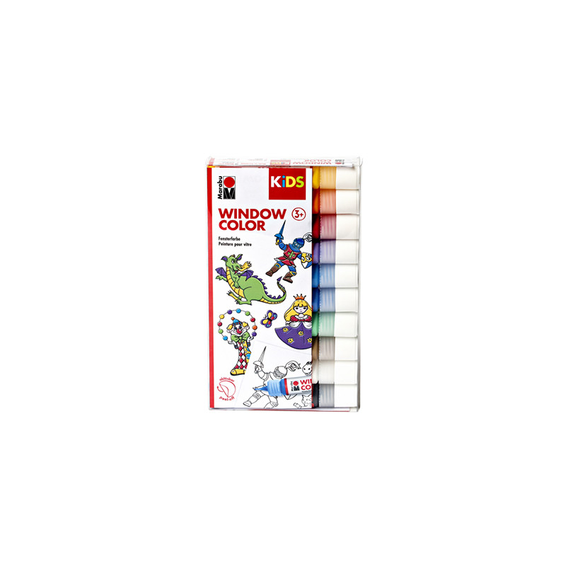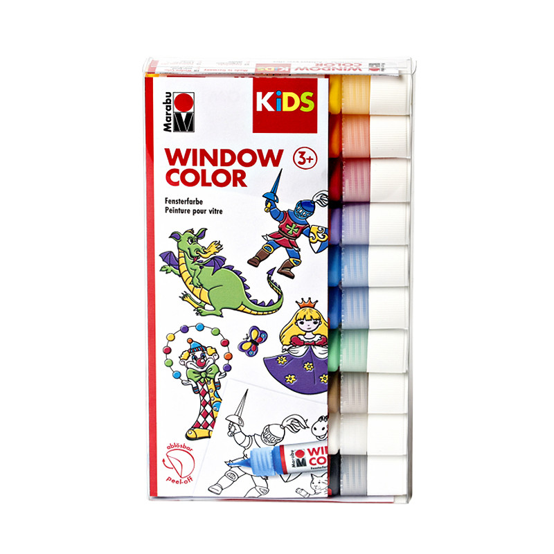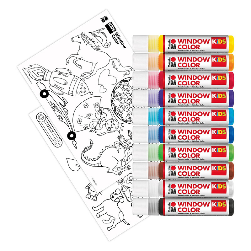 Witrażowe farby żelowe Window Color Kids marki Marabu. Zestaw 10 kolorów w buteleczkach z aplikatorem o pojemności 25 ml. Więcej szczegółów