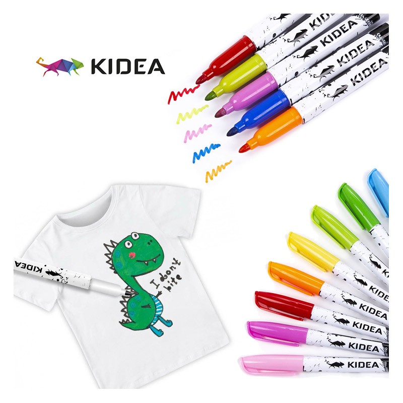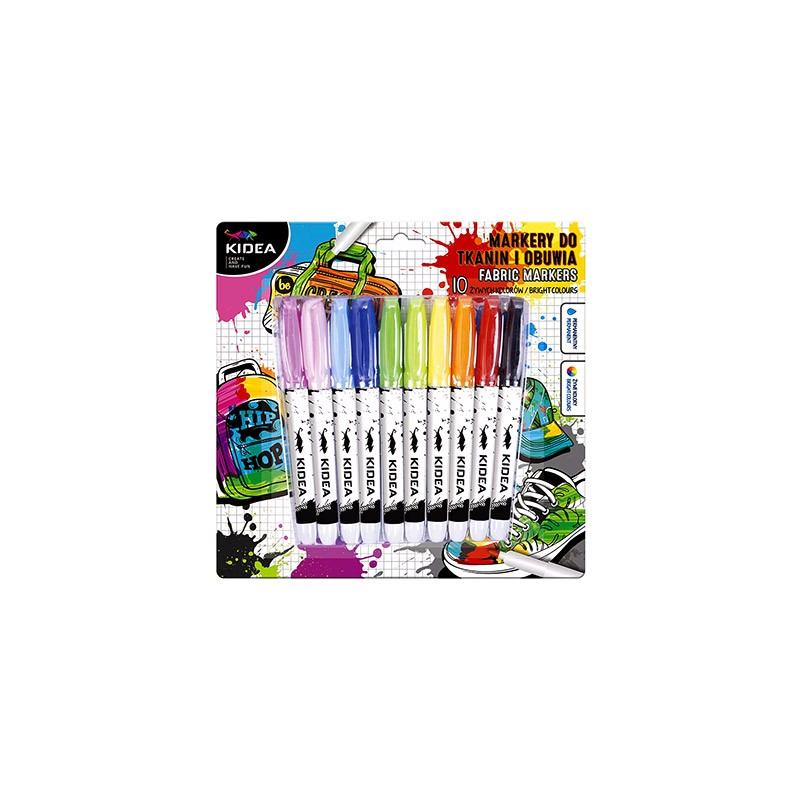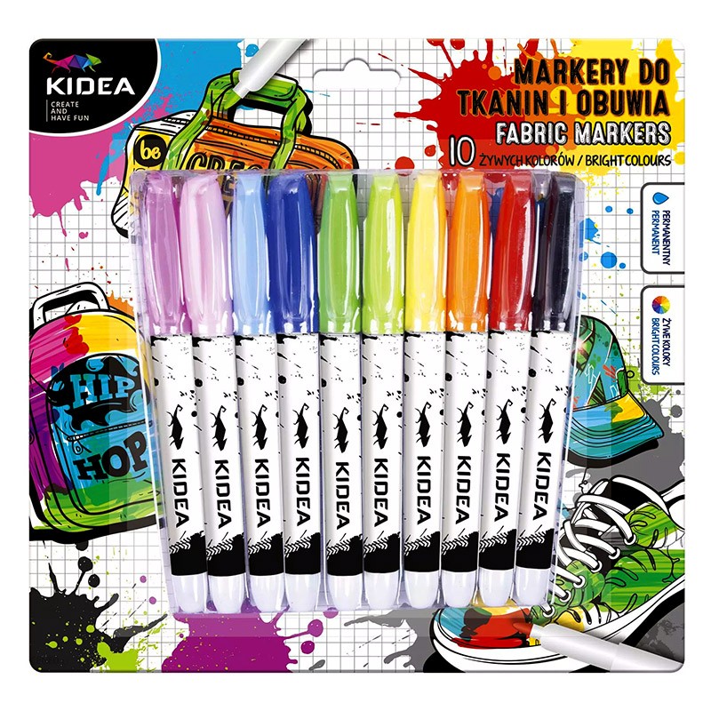 Precyzyjne pisaki do malowania tkanin – 10 kolorów o intensywnym nasyceniu. Produkt przeznaczony do zdobienia ubrań i obuwia wykonanych z materiału - nie nadaje się do tekstyliów z PCV oraz skóry. Pisakami malować po czystych i suchych powierzchniach, pozostawić do wyschnięcia na 24 h. Tusz jest permanentny i odporny na spieranie. Dekorowane przedmioty można prać w 30 stopniach. Kolory można mieszać ze sobą tworząc nową paletę barw. Markery do tkanin Kidea bardzo dobrze prezentują się na jasnych tkaninach - są wyraźne i nasycone. Precyzyjna, filcowa końcówka umożliwia rysowanie drobnych detali.