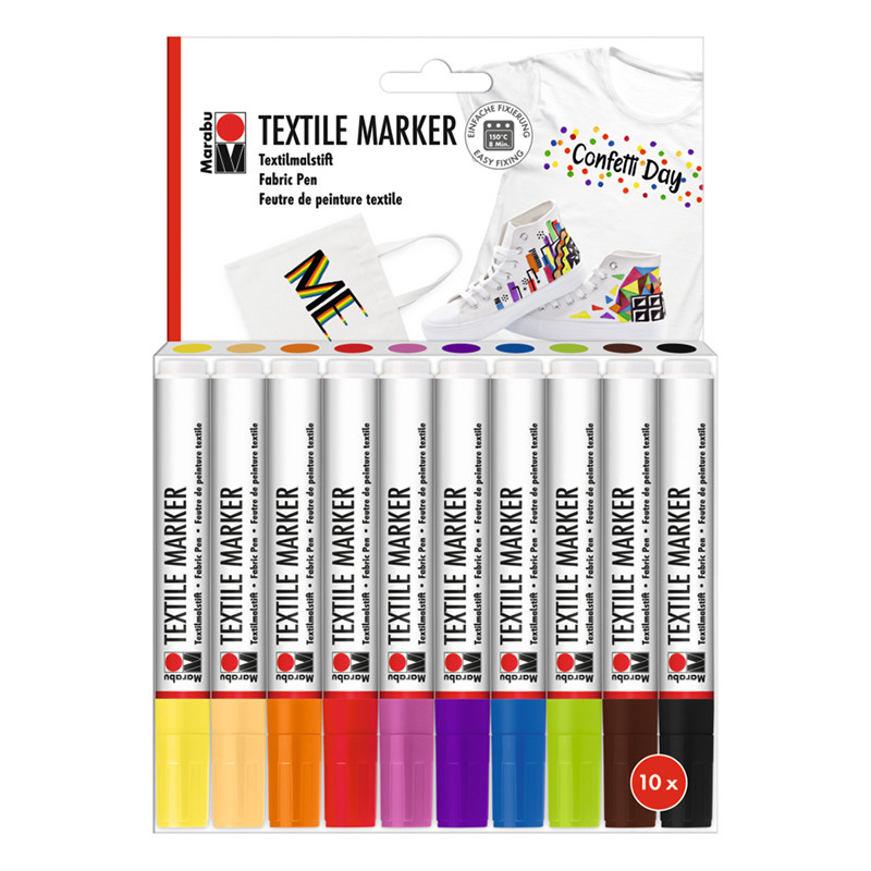 10 pisaków Textile Marker do jasnych tkanin marki Marabu, komplet podstawowych kolorów. Końcówka pisania o grubości 3 mm