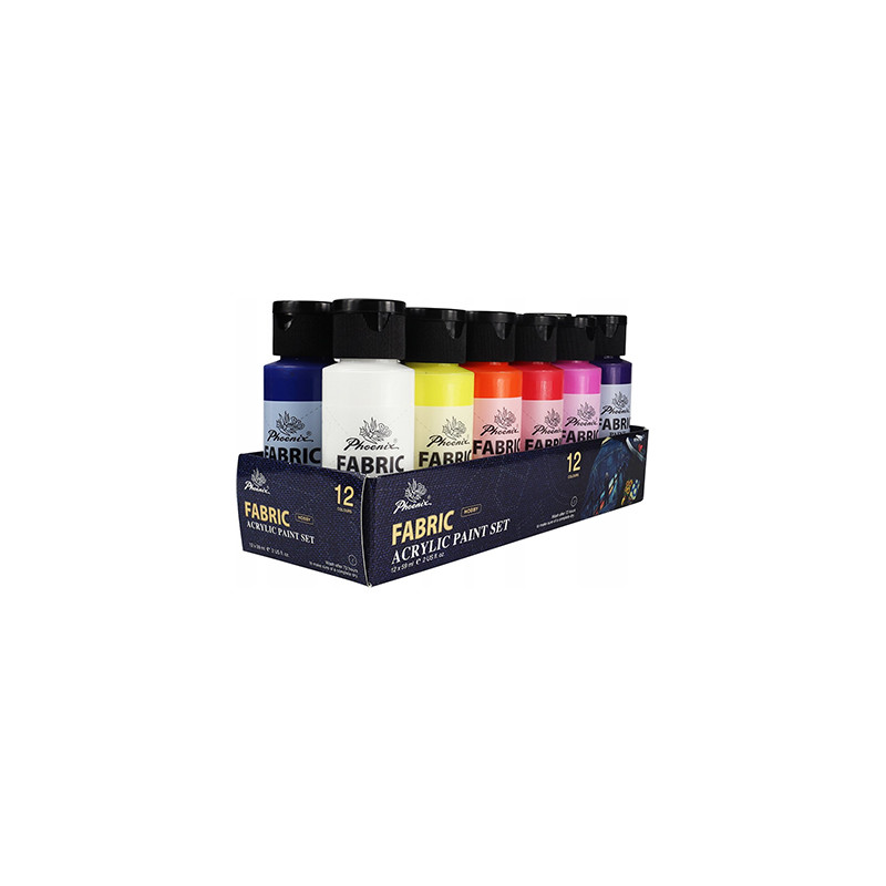 Komplet farb do tkanin marki Phoenix, 12 kolorów w buteleczkach o pojemności 59 ml.