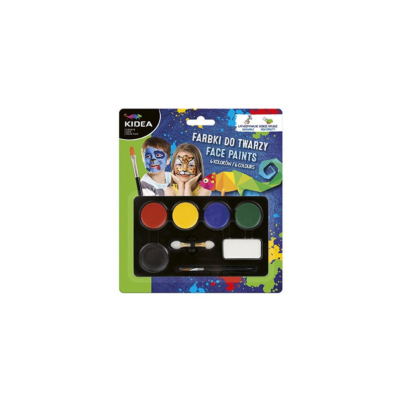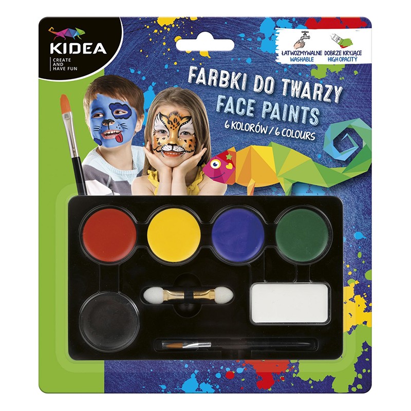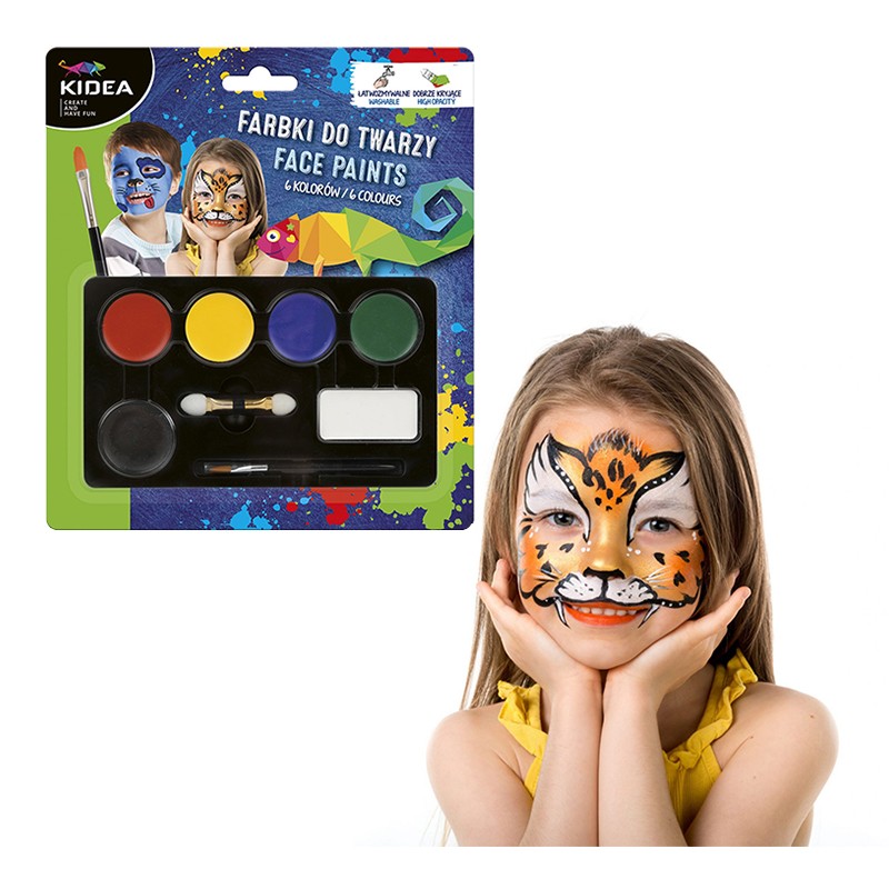 Farby do malowania twarzy marki Kidea. 6 kolorów podstawowych + pędzelek oraz aplikator. Kolory są dobrze kryjące i łatwo zmywalne. Więcej szczegółów