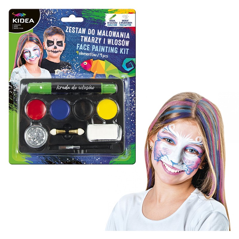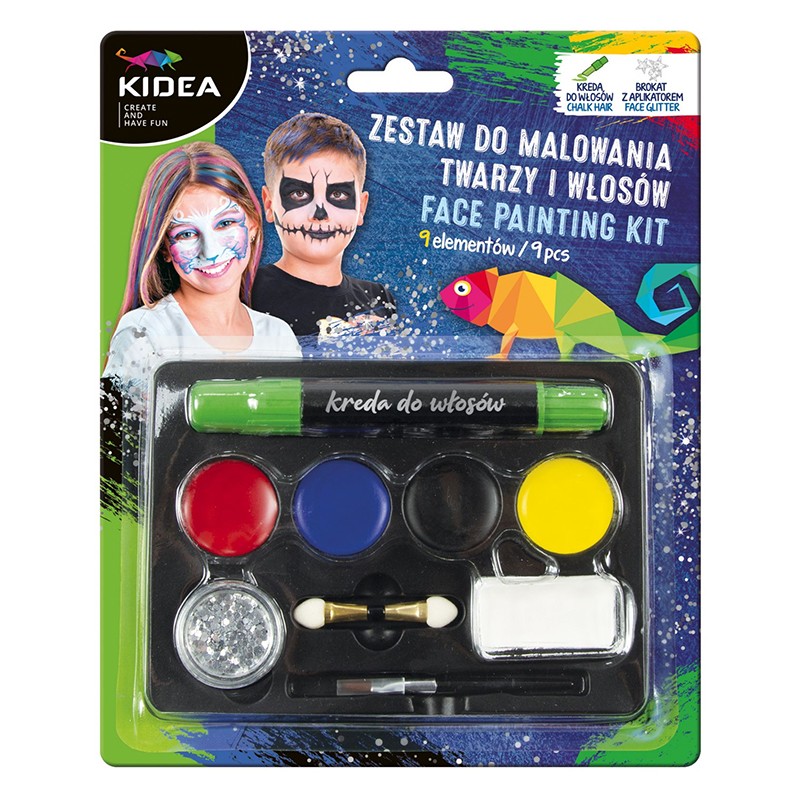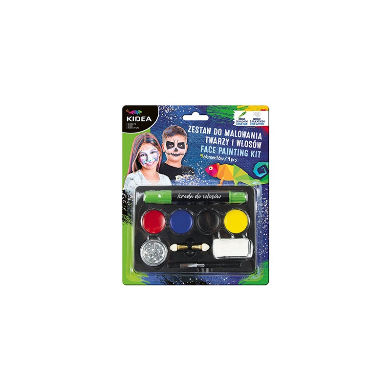 Farby do malowania twarzy i włosów marki Kidea. 5 kolorów podstawowych, zielona kreda do włosów, sypki brokat + pędzelek oraz aplikator. Więcej szczegółów
