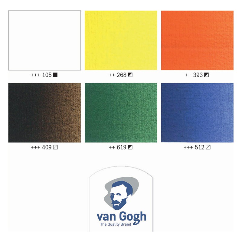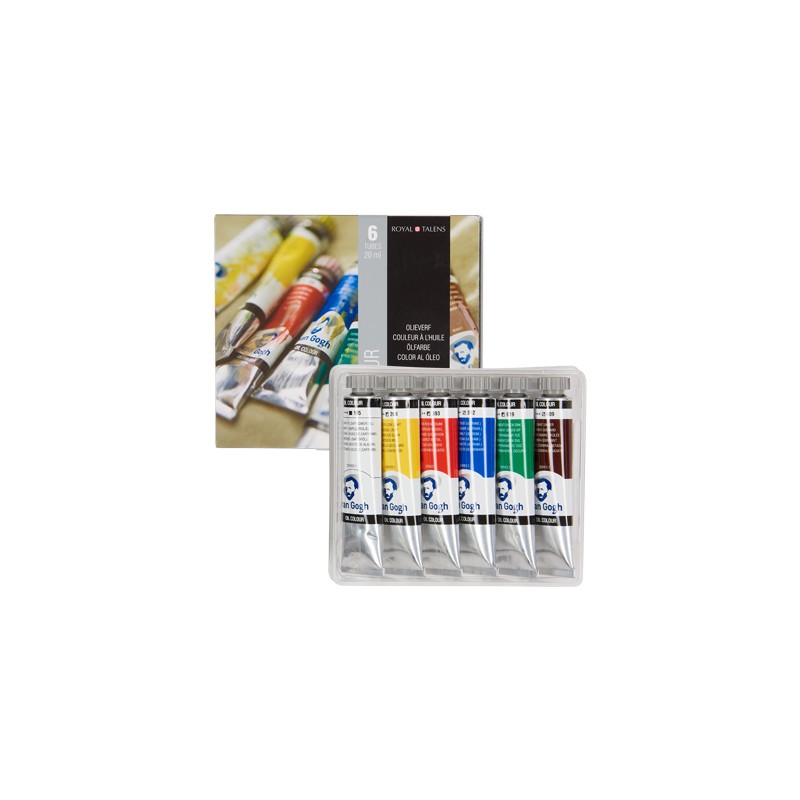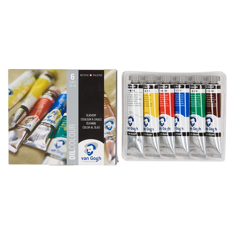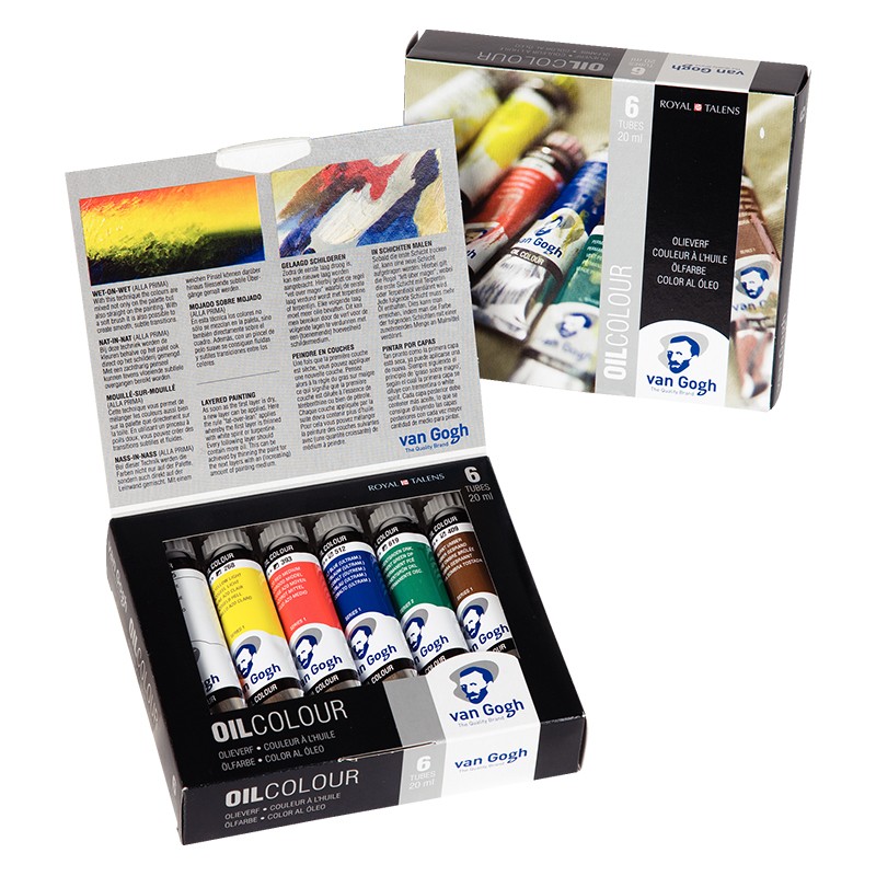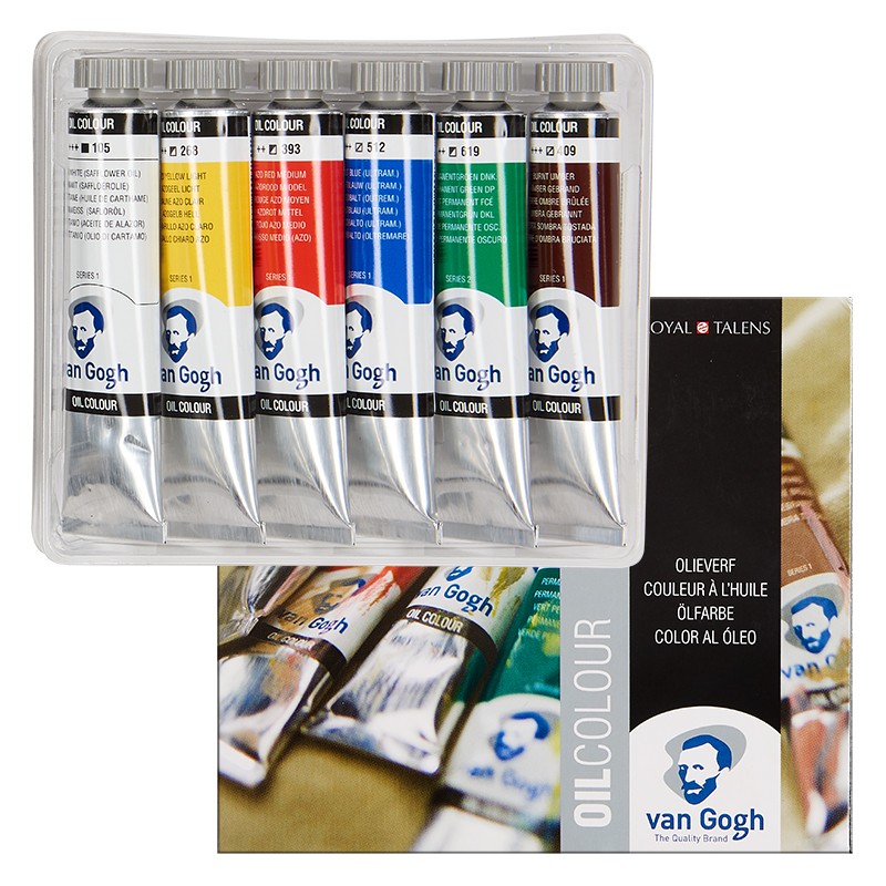 Wysokiej jakości farby olejne serii Van Gogh holenderskiej firmy Royal Talens. Zestaw 6 podstawowych kolorów w tubkach o pojemności 20 ml. Więcej szczegółów