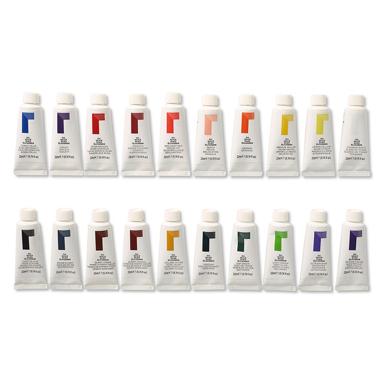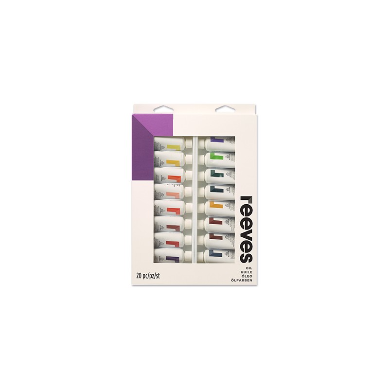 Olejne farby marki Reeves, 20 tubek o pojemności 22 ml. Dobrej jakości oleje polecane dla studentów i początkujących artystów.