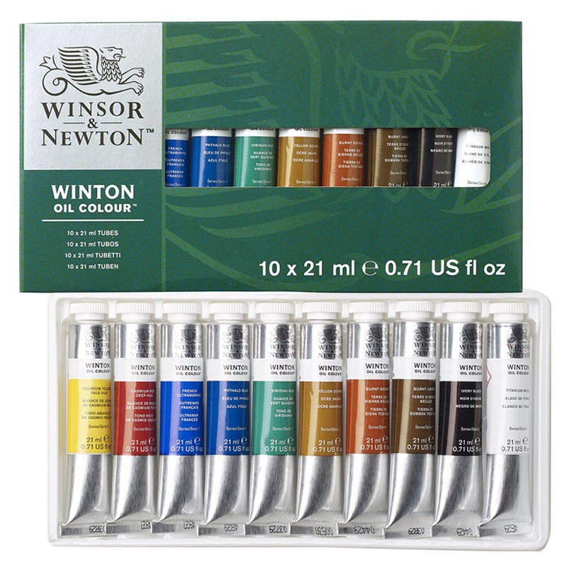 Farby olejne serii Winton angielskiej firmy Winsor&Newton. Zestaw 10 kolorów w tubkach o pojemności 21ml.