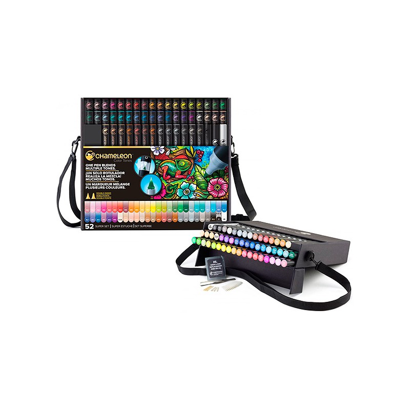 Chameleon Set - ekskluzywny zestaw 52 markerów tonalnych, uzupełniony blenderem i dedykowanym cienkopisem. Kompletna oferta produktów z serii Chameleon. Umieszczone w trójpoziomowym, uchylnym piórniku z możliwością założenia na ramię dzięki dołączonemu regulowanemu paskowi.