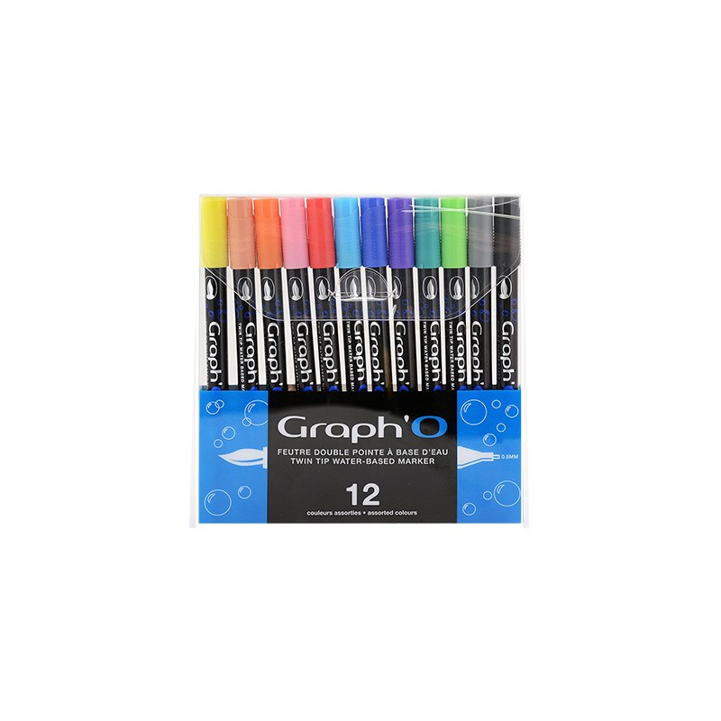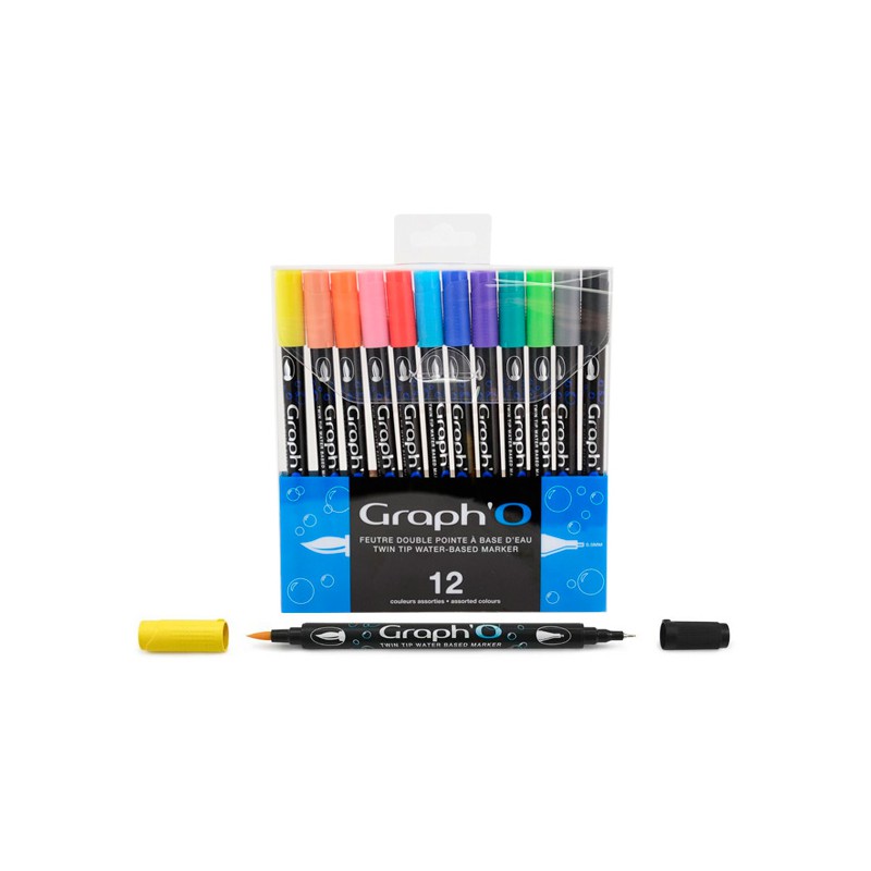Zestaw dwustronnych markerów na bazie wody Graph'O. Pisaki z dwoma końcówkami: elastyczna końcówka pędzelkowa oraz cienka precyzyjna końcówka o grubości 0.5mm, wypełnione transparentnym tuszem, łatwo mieszalne. Komplet 12 kolorów.