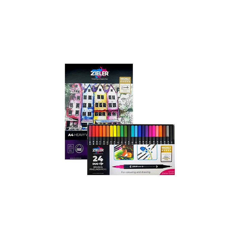 24 Duo Tip Brush & Fineliner + blok Heavy Weight Cartridge Pad A4 – komplet dwustronnych pisaków marki Zieler oraz uniwersalny blok A4.
