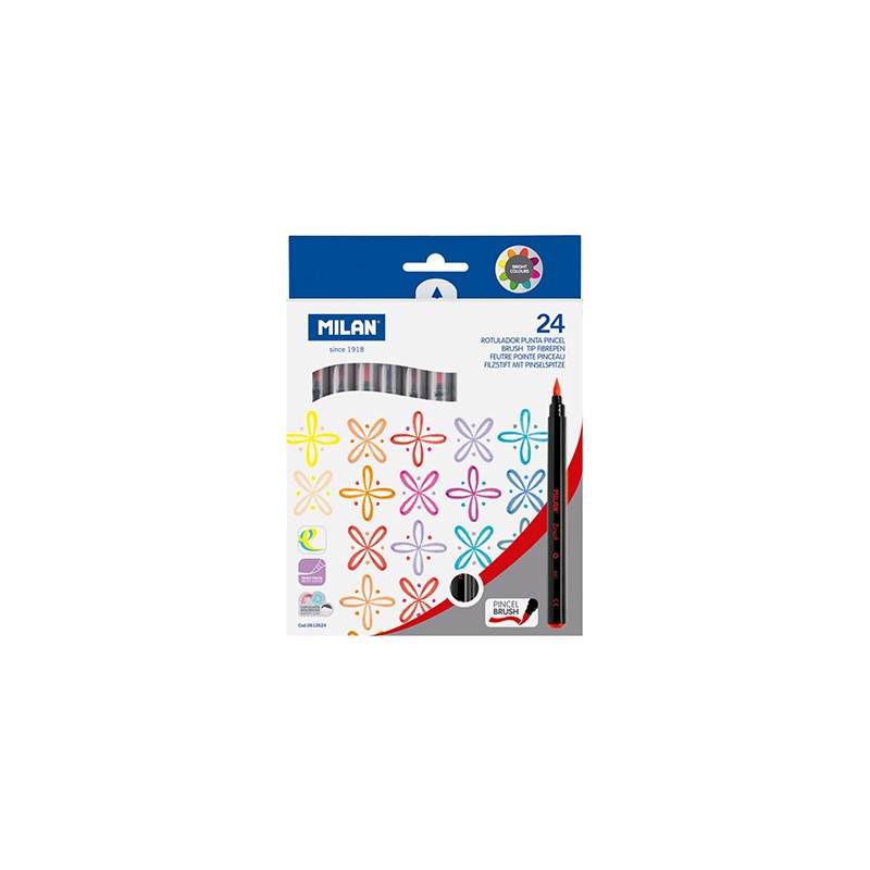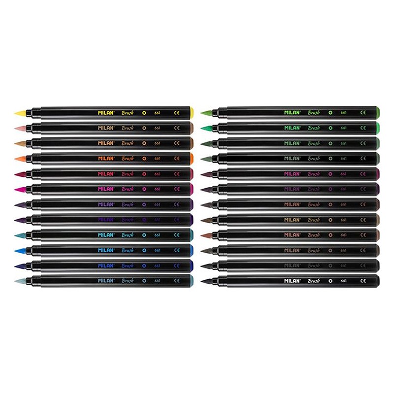 Komplet pisaków pędzelkowych marki Milan. 24 pisaki na bazie wody w podstawowej gamie kolorystycznej. Kartonowe opakowanie. Więcej szczegółów