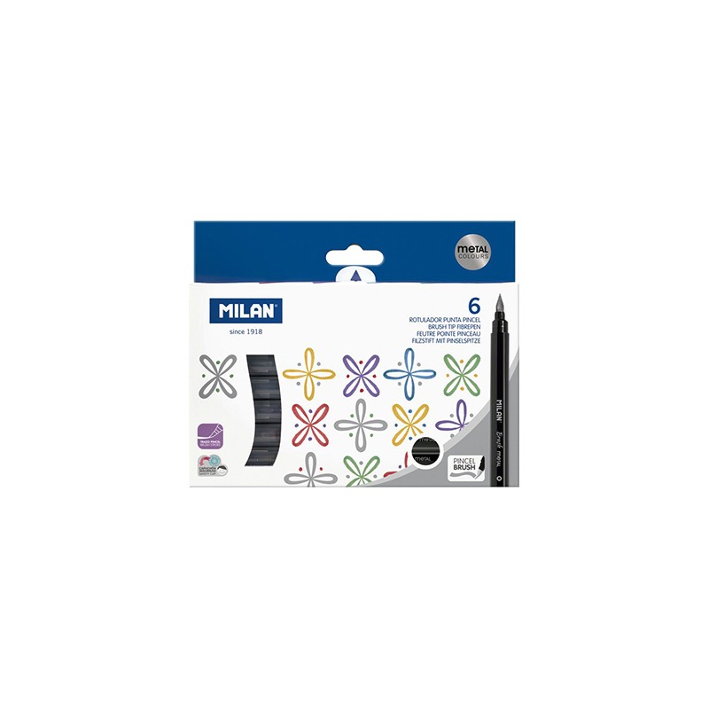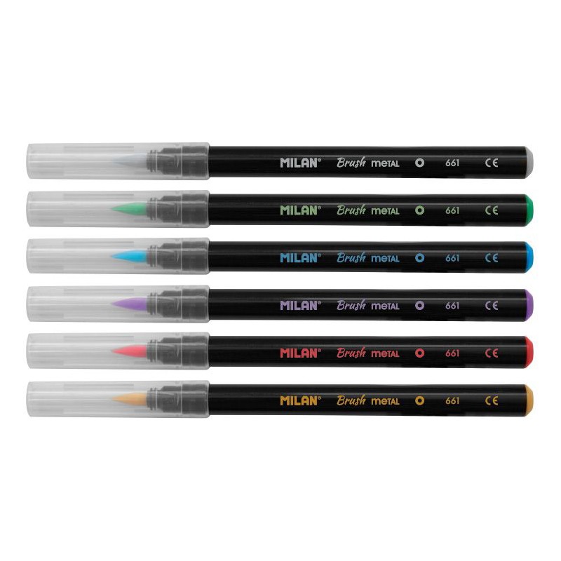 Komplet pisaków pędzelkowych marki Milan. 6 pisaków na bazie wody – metaliczna gama kolorystyczna. Kartonowe opakowanie. Więcej szczegółów