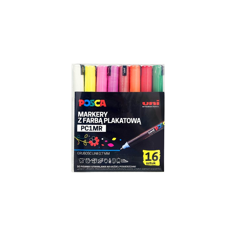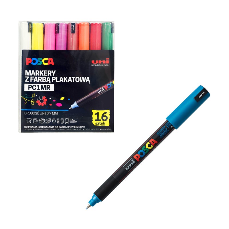 Zestaw markerów Uni POSCA 1MR – 16 sztuk w podstawowej gamie kolorystycznej. Końcówka o szerokości 0.7 mm. Markery z farbą plakatową. Więcej szczegółów