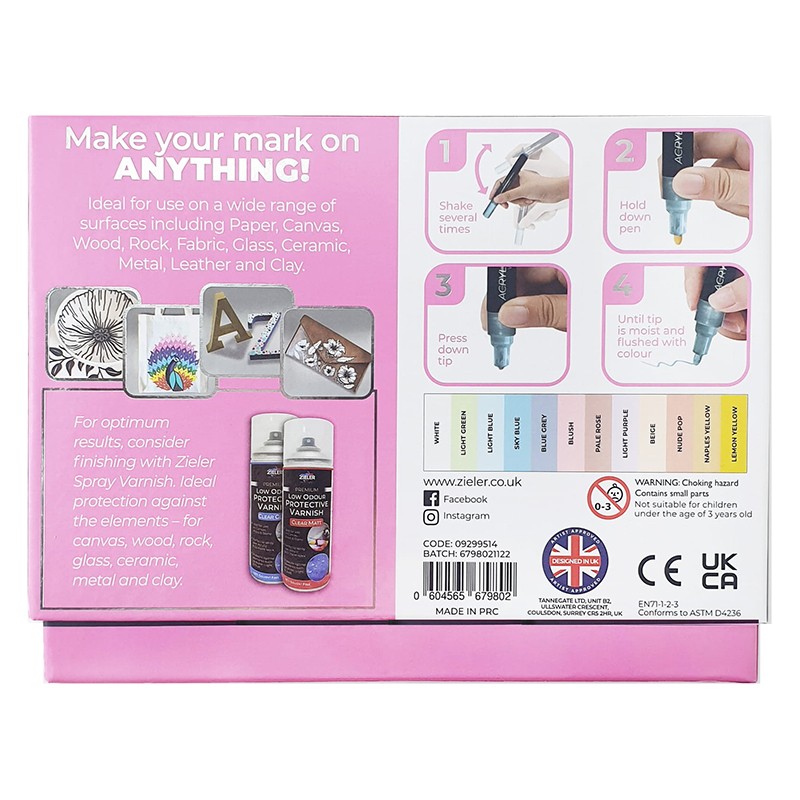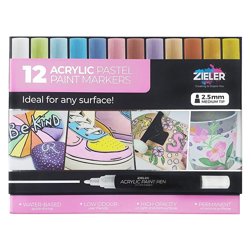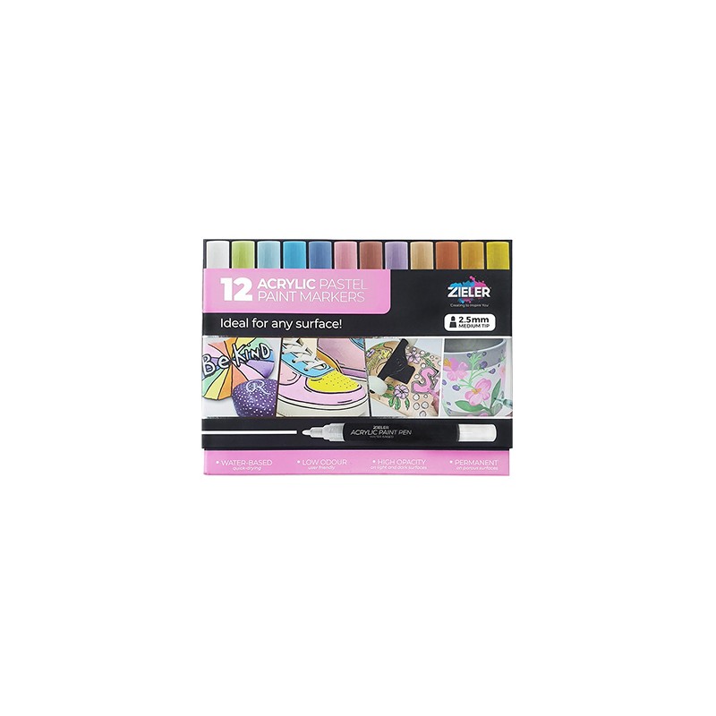 Uniwersalne pisaki marki Zieler, wypełnione kryjącą farbą akrylową. 12 pastelowych kolorów. Pisaki posiadają filcową końcówkę o szerokości 2.5 mm. Markery można stosować na różnych powierzchniach, takich jak papier, karton, tektura, plastik, płótno, kamień, tkanina, metal czy szkło. W celu zabezpieczenia powstałych pracy można pokryć je bezbarwnym lakierem.