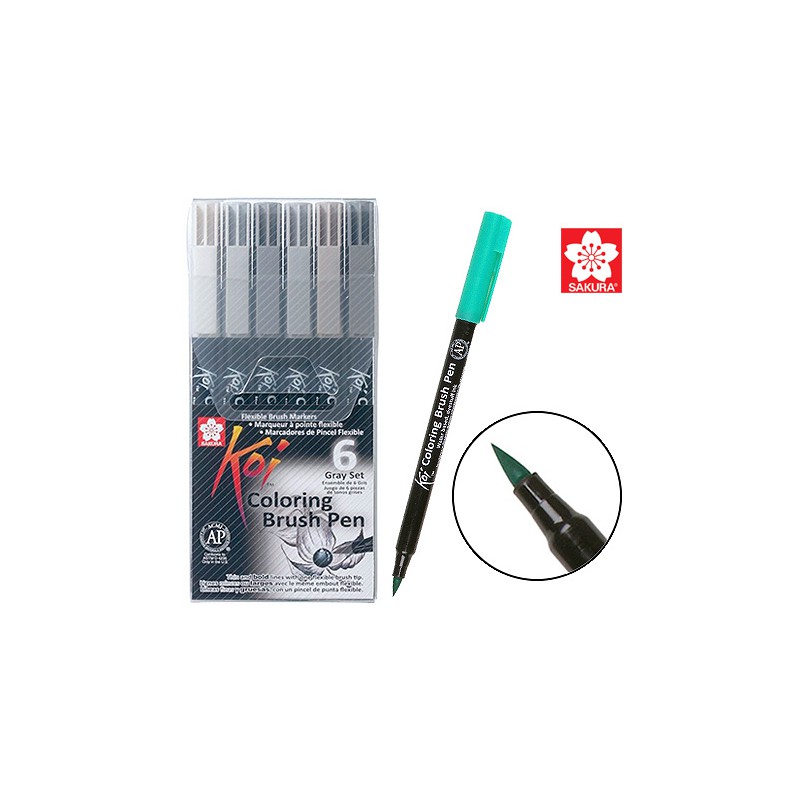 Zestaw 6 pisaków Koi Coloring Brush Pen japońskiej firmy Sakura. Pisaki wyposażone są w elastyczną, pędzelkową końcówkę. Wysokiej jakości, bezwonny atrament na bazie wody powoduje, że łączenie ze sobą kolorów jest łatwe i przyjemne. Grubość prowadzonej linii zależna jest wyłącznie od naszego nacisku na narzędzie. Doskonale sprawdzą się przy ilustracjach, szkicach, komiksach a nawet stemplach.