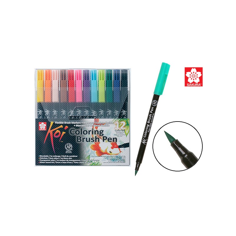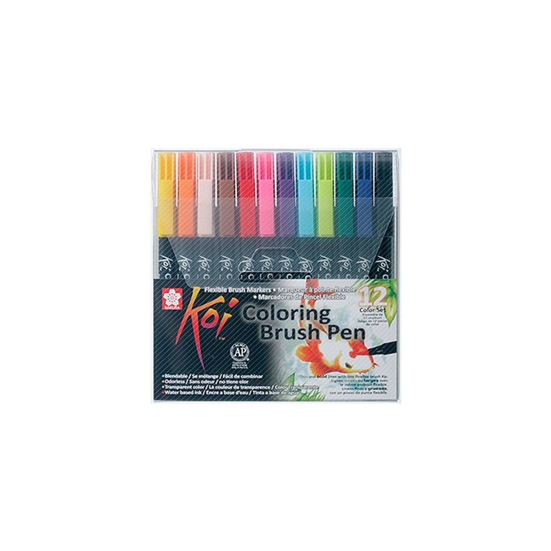 Zestaw 12 pisaków Koi Coloring Brush Pen japońskiej firmy Sakura. Pisaki wyposażone są w elastyczną, pędzelkową końcówkę. Wysokiej jakości, bezwonny atrament na bazie wody powoduje, że łączenie ze sobą kolorów jest łatwe i przyjemne. Grubość prowadzonej linii zależna jest wyłącznie od naszego nacisku na narzędzie. Doskonale sprawdzą się przy ilustracjach, szkicach, komiksach a nawet stemplach.